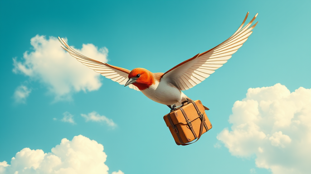 Logo for travel website featuring a crimson bird with delicate ivory wings clutching a vintage travel suitcase in its beak, soaring through a cerulean sky dotted with fluffy white clouds. The scene embodies intricate artwork reminiscent of Beatrix Potter, capturing the charm of a cottage core aesthetic. Rendered in exquisite detail at an 8K resolution, the composition is angled at 45 degrees, highlighting the harmonious blend of nature and travel, evoking a sense of whimsical adventure.