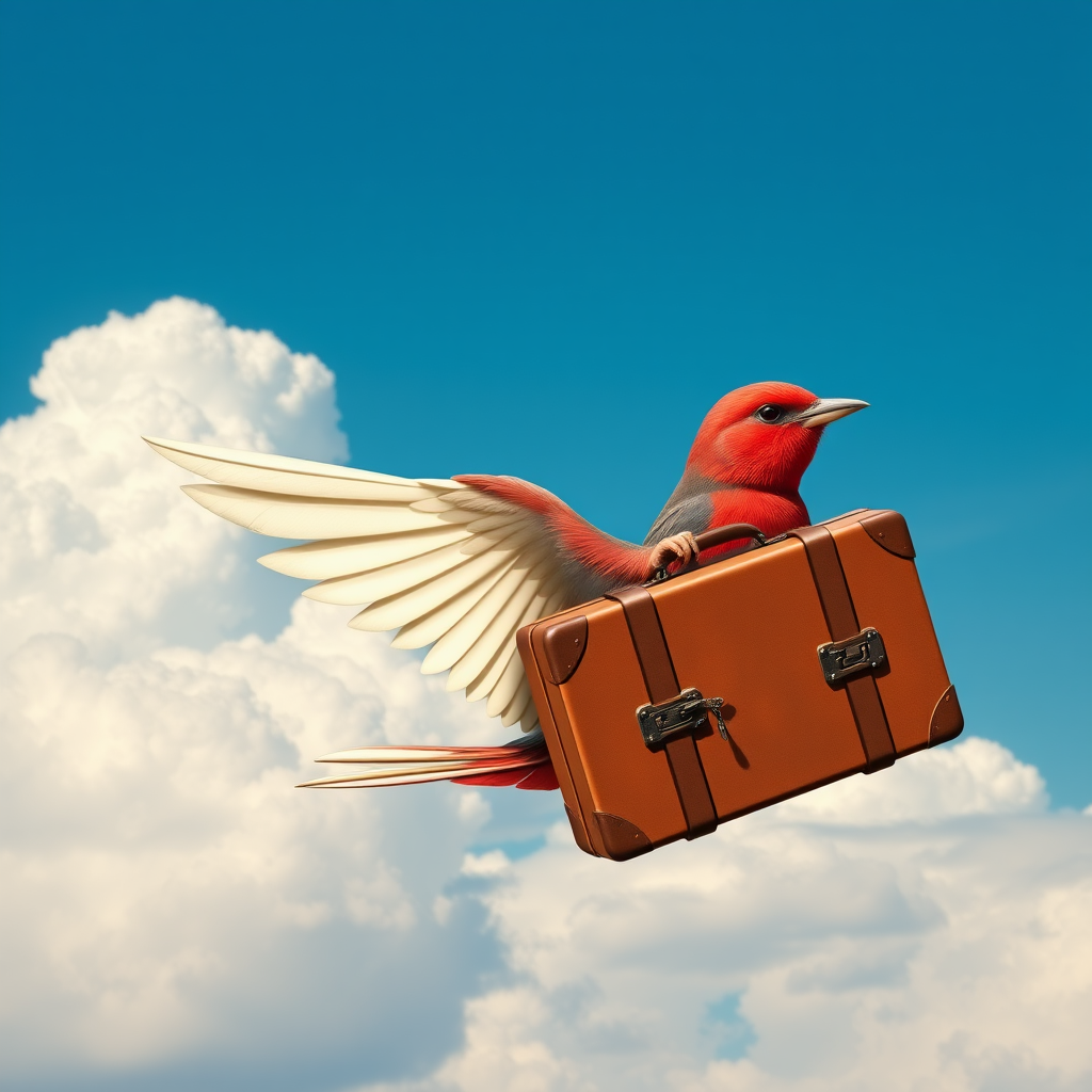Logo for travel website featuring a crimson-hued bird with ivory wings gracefully clutching a vintage suitcase against a backdrop of azure sky and fluffy cumulus clouds; reminiscent of Beatrix Potter’s detailed style with a touch of whimsy, encapsulating a cottagecore aesthetic; 8K resolution with exquisite detail captured from a dynamic 45-degree angle.