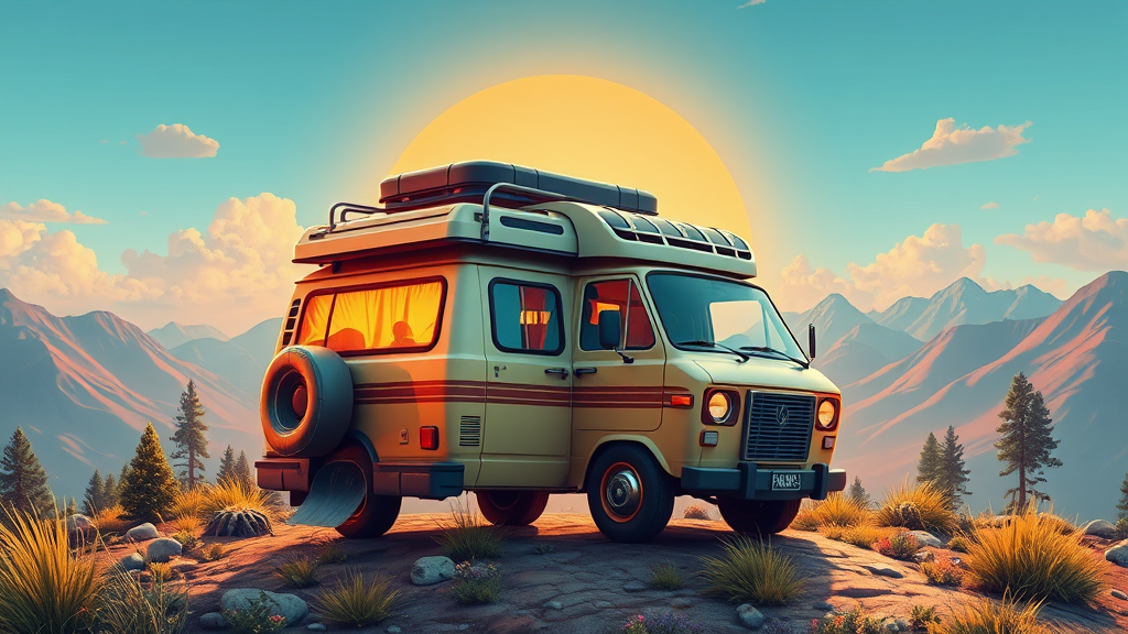 Logo icon 3d camper van adventure graphic design realistic high detail vivid color artwork landscape ultra-high resolution