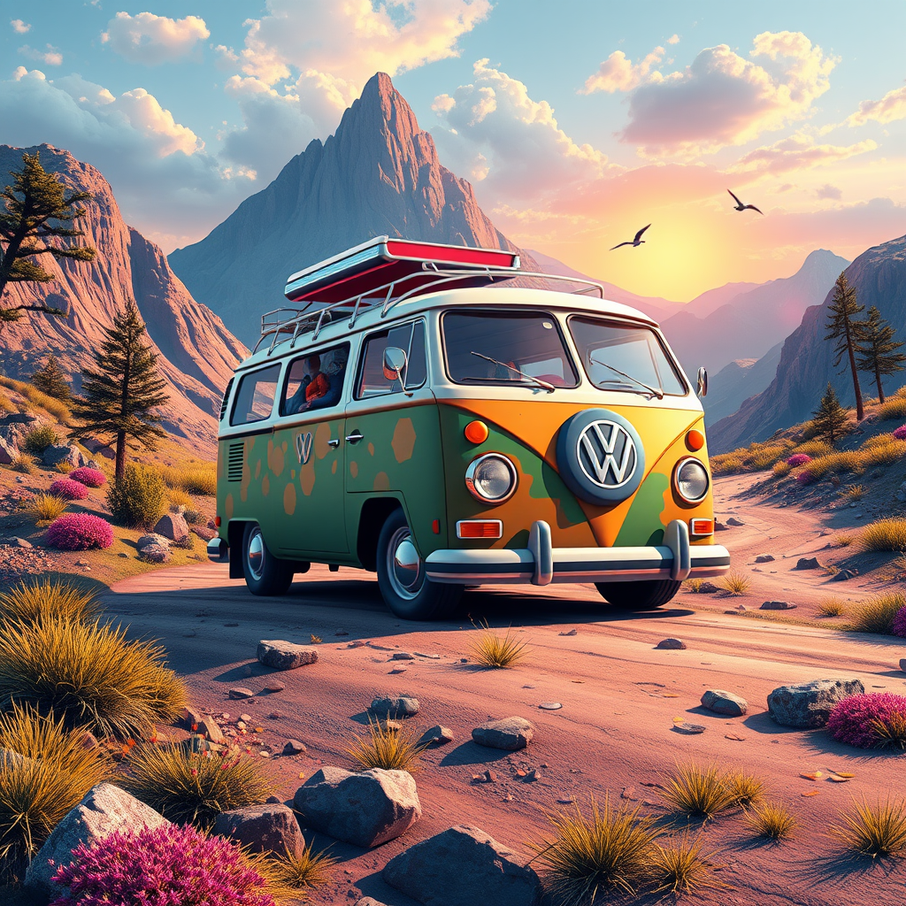 Logo icon 3d kombi adventure graphic design realistic high detail raw color art landscape 8k vibrant imaginative journey intricate visual elements captivating environment retro flair radiant colors.