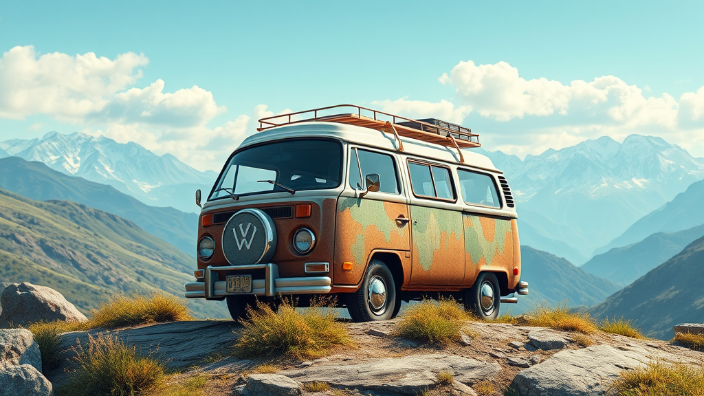 Logo icon 3D kombi adventure vibrant graphic design realistic high detail RAW color art landscape 8k intricate textures dynamic elements imaginative twists captivating scenery.