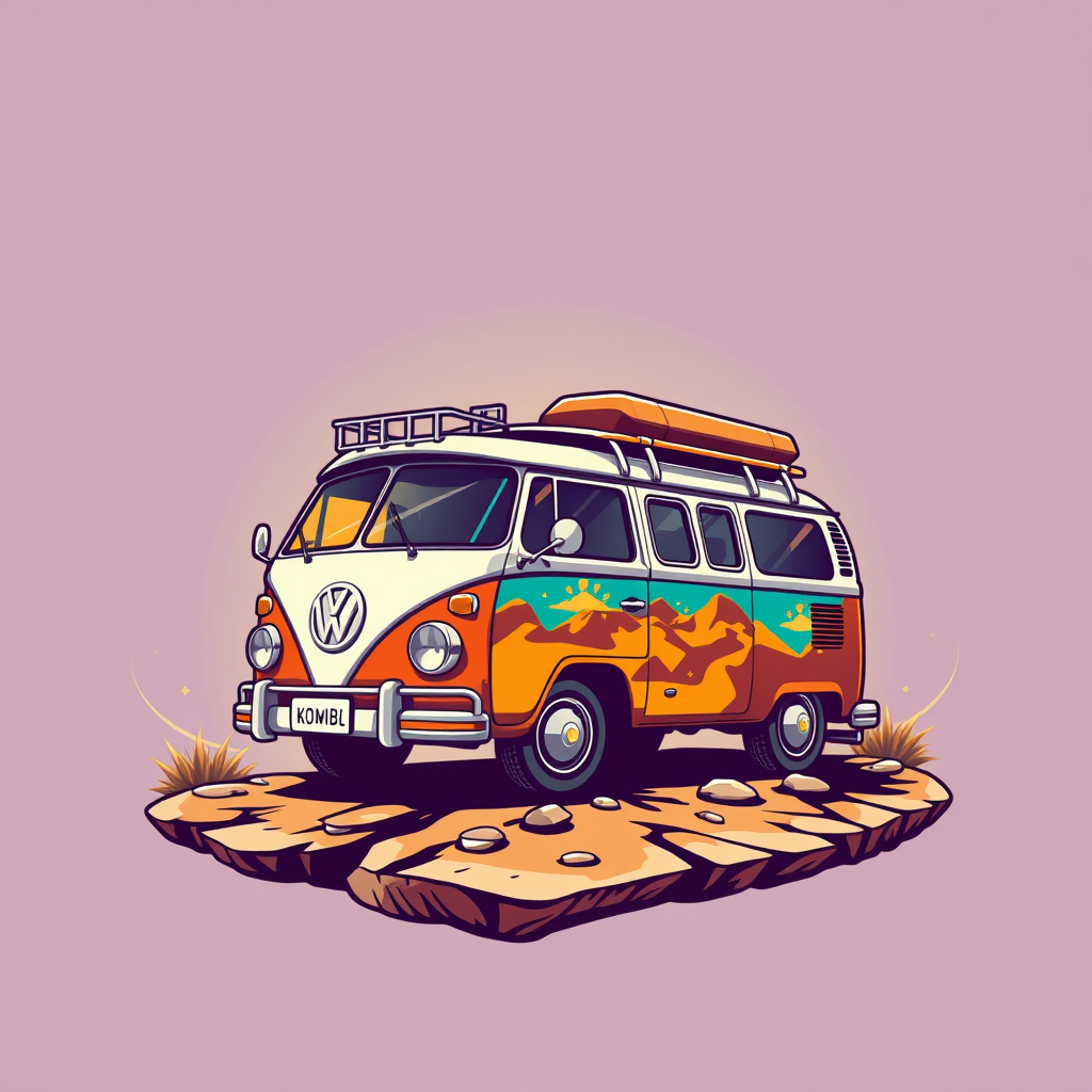 Logo icon, 3d kombi van, adventure theme, intricate graphic design, realistic high-detail artwork, vivid RAW color, landscape backdrop, 8k resolution, imaginative twists, vibrant exploration motif.