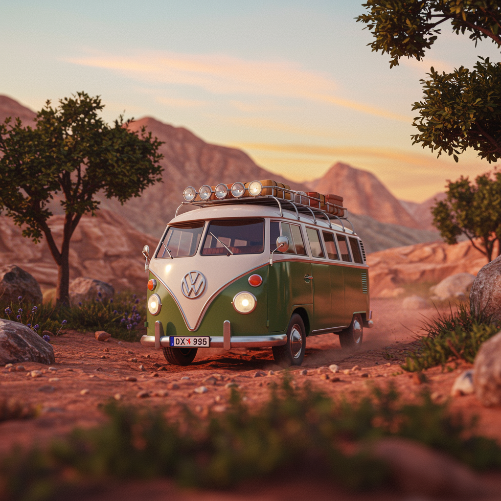 Logo icon featuring a 3D kombi set in an adventurous landscape, rendered in realistic high-detail RAW color art with a vibrant palette. The scene depicts a dynamic drive through diverse terrains, capturing the spirit of exploration with intricate design elements. The composition is highly detailed and presented in 8k resolution, blending elements of graphic design with stunning realism.