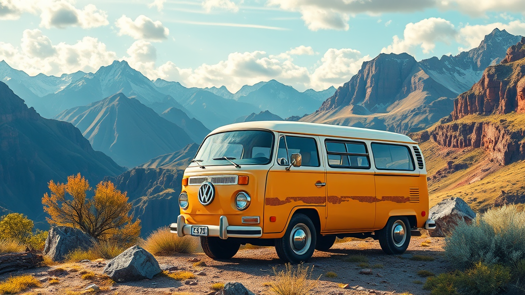 Logo icon featuring a 3D realistic Kombi van set against a breathtaking adventure landscape, rendered in high detail RAW color art. The scene captures the spirit of exploration with vibrant, lifelike details, showcasing the Kombi's iconic design. Surrounded by a vivid paisagem, every element is enhanced with an 8k resolution for unmatched clarity, blending graphic design elements with a touch of artistic creativity.