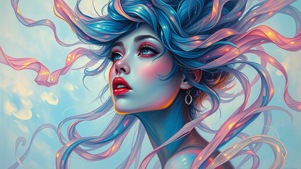 Loish, James Jean, ethereal female figure composed of flowing ribbons and wisps of smoke, suspended in the sky, adorned with vibrant and mystical colors, contemporary impressionism style, influenced by Yanjun Cheng’s portrait artistry, iridescent painting with a 3/4 perspective view, featuring a charming face with a low angle perspective, dynamic swirling composition, eyes like large beautiful crystals with vivid irises, rendered in UHD, HDR, 8K resolution, Dark Sushi Mix Colorful model inspiration, ensuring elegance and beauty without distortions or imperfections, maintaining clarity and detail, free of distractions like watermarks or artifacts, seamlessly captured within the frame.
