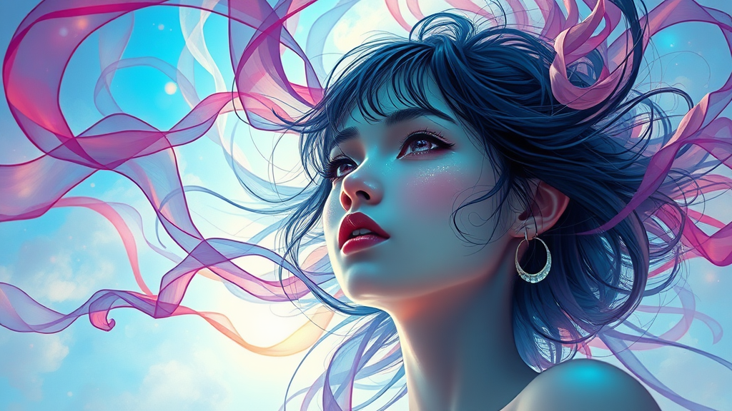 Loish, James Jean, ethereal female figure composed of swirling ribbons and mist, suspended in the sky, bursting with color and vibrancy, imbued with mystical hues, inspired by contemporary impressionism, Yanjun Cheng portrait style, iridescent painting, 3/4 perspective view, charming expression, low vantage point, dynamic circular composition, enchanting large crystalline eyes with vivid irises, UHD, HDR, 8K quality, Model: Dark Sushi Mix Colorful.