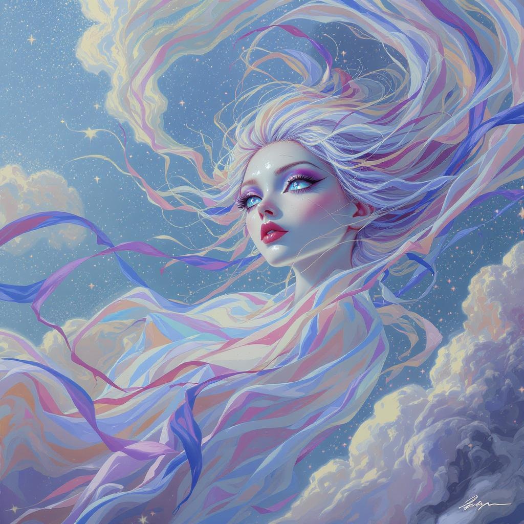 Loish, James Jean, ethereal female figure composed of ribbons and smoke, gracefully floating in the sky. The scene is colorful and vibrant, infused with mystical hues, embodying contemporary impressionism. Inspired by Yanjun Cheng portrait painting, the iridescent artwork is presented in a 3/4 perspective view, featuring a cute face. The composition is imagined from a low angle with a sweeping, circling motion. The figure has large, mesmerizing crystal eyes with big irises. Rendered in UHD, HDR, 8K for clarity and detail, maintaining the enchantment. The design avoids duplicates, disfigurements, and mutations, ensuring a harmonious and captivating portrayal. No blurry, out-of-frame elements or unwanted artifacts like watermarks, logos, or text are present. The visual captures elegance and wonder without any distortions, showcasing the beauty of art and creativity.