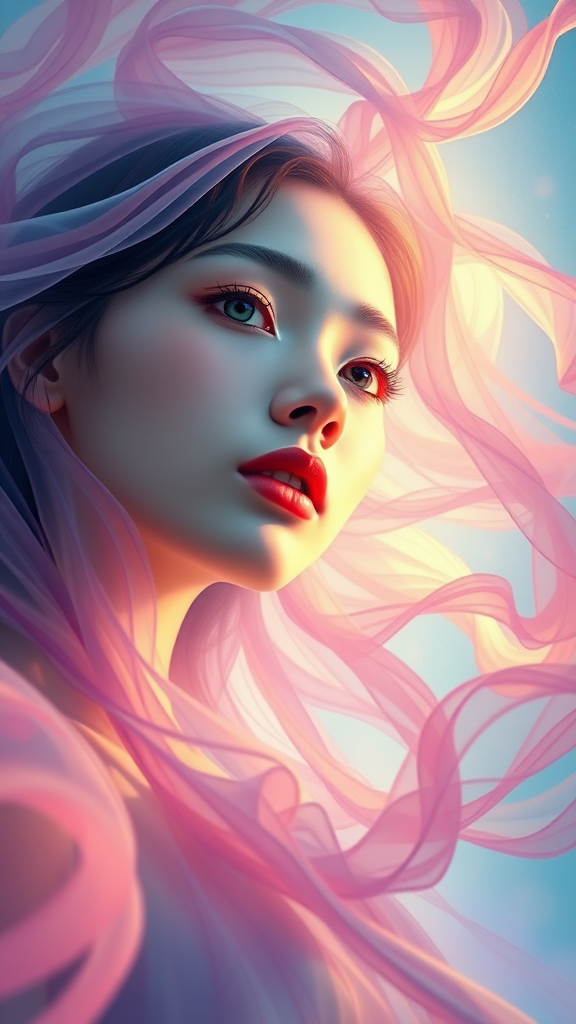 Loish, james jean, ethereal female figure made of silky ribbons, mist, suspended in the sky, vivid and vibrant, mystical hues, modern impressionism, yanjun cheng portrait influence, luminescent painting, 3/4 perspective view, charming face, low angle, dynamic swirling composition, large enchanting crystal eyes, prominent irises, UHD, HDR, 8K, Dark Sushi Mix Model Variation, By, graceful, flowing, harmonious, captivating, dreamy, celestial, elegant, serene expression, balanced proportions, seamless appearance, atmospheric, enchanting skin, intricate details, seamless blend, visually stunning, stunning clarity.