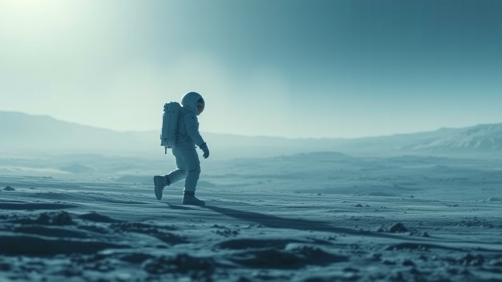 Lone astronaut exploring a desolate lunar landscape bathed in a serene glow, the scene enveloped in an icy blue and silver color palette, subtle and understated hues merging to create a sense of quiet isolation, every detail of the astronaut's suit and the moon's surface rendered with precision, the sharp clarity emphasizing the stark beauty and solitude of the celestial environment.