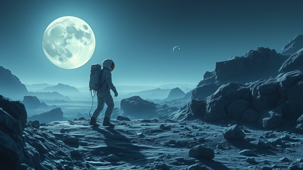Lone astronaut exploring an alien landscape bathed in the pale glow of the moon, surrounded by an ethereal expanse using a cold, muted color palette of blues and grays, capturing intricate details of the rocky terrain and the astronaut's suit in sharp focus, hints of mysterious distant celestial bodies adding a touch of wonder to the scene.