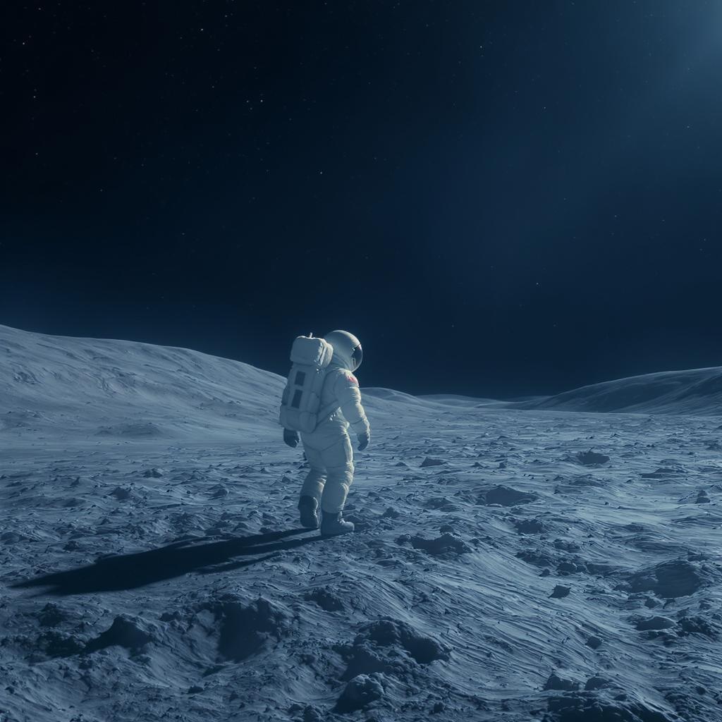 Lone astronaut exploring the moon's surface, enveloped in a serene, cold color palette of blues and grays, with muted, subtle hues; highly detailed and in sharp focus, capturing the intricate textures of the lunar landscape and the indigo-tinted sky's vastness, small stars shimmering faintly in the distance.