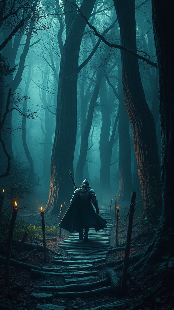 Lone knight journeying through enchanted forests| medieval fantasy realm| digital illustration| elaborate details| masterwork quality| highly intricate| role-playing game atmosphere| dramatic cinematic lighting| rich medieval aura| mystical ambiance unwanted-image-v2-39000 subtle-negative ng_deepnegative_v1_75t.