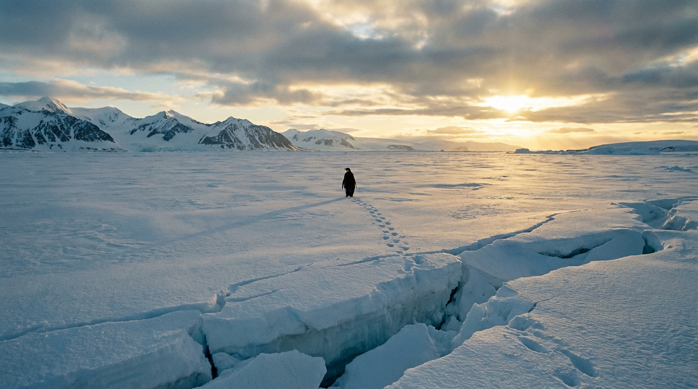 A solitary penguin leaves footprints across a vast, snow-covered Antarctic plain towards distant mountains. The scene is illuminated by warm golden hour light breaking through partially cloudy skies, casting long shadows and highlighting dramatic ice cracks.