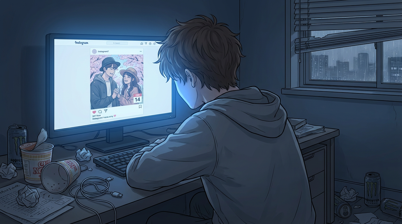 Anime style illustration of a young man with messy brown hair, viewed from behind, sitting at a cluttered desk in a dark room. He is wearing a grey hoodie and looking intently at a glowing computer monitor. The monitor displays an Instagram post of a happy couple, with the date "FEB 14" visible. The room is dimly lit, with the only significant light source being the computer screen, casting a blue glow on the man's face and the immediate desk area. Empty instant ramen cups and tangled wires are scattered across the desk and floor. The overall mood is melancholic and solitary. Dark blue and grey color palette, with subtle hints of warmer tones from the screen image. Detailed line art with soft shading.