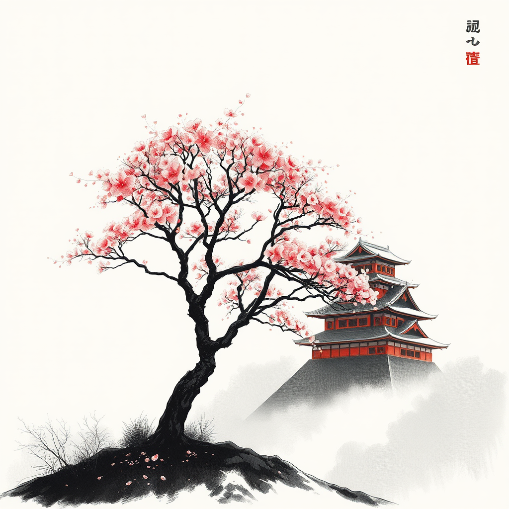 Lonely sakura tree atop a serene hill, set against the backdrop of an imposing black and red Japanese castle, presented in the style of a minimalistic scroll painting, evoking the elegance of a sumi-e drawing, with a touch of Luis Royo's dramatic flair, devoid of human presence.