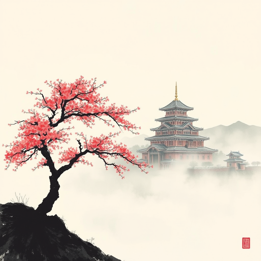 Lonely sakura tree on a serene hill, a majestic Japanese castle in the distance, hues of black and crimson, reminiscent of traditional scroll painting, sumi-e style with minimalist elegance, evoking the mystique of Luis Royo's artistry, devoid of human presence.