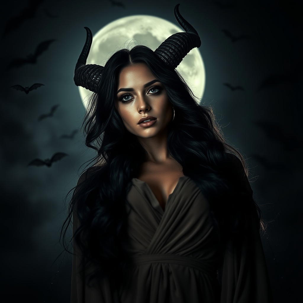 A woman with striking, long ebony hair, adorned with elegant horns, donned in a flowing taupe gown that accentuates her mysterious allure. The scene unfolds in a shadowy, mist-laden backdrop where bats flutter, adding an eerie yet enchanting ambiance. Her hair cascades in gentle waves, providing a striking frame around her intense gaze. Dim lighting prevails, with a majestic full moon behind her, casting a soft, otherworldly glow that enhances her formidable presence. The perspective is dramatically captured from below, emphasizing her commanding aura. The style embodies fantasy art, characterized by high-contrast lighting and vivid hues. This imagery is likely captured using a digital SLR or mirrorless camera, employing a wide-angle lens to encompass the vast, moody expanse surrounding her.