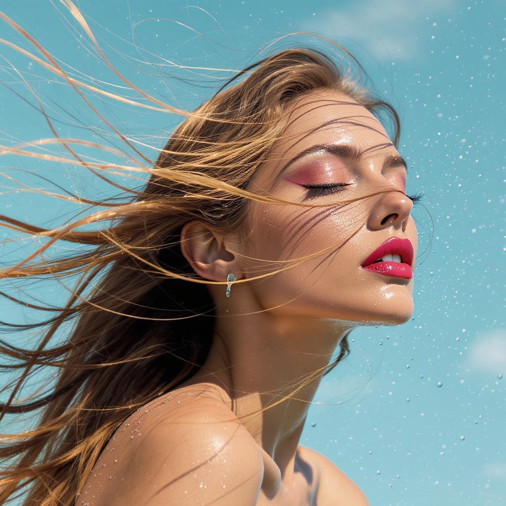 a woman with flowing long hair caught in the breeze, evoking a sense of movement and grace, in a style inspired by pop art aesthetics, featuring hyper-realistic water droplets that shimmer like sequins, reminiscent of animated gifs. the scene captures the sleek and sophisticated photographic style of mario testino, with a close-up focus that reveals intricate details. the overall atmosphere is soft and dreamy, enveloped in a sky-blue palette with warm brown accents. the composition follows a vertical orientation, with an artistic touch that blends stylization and realism, aiming for a visually captivating and emotive representation.