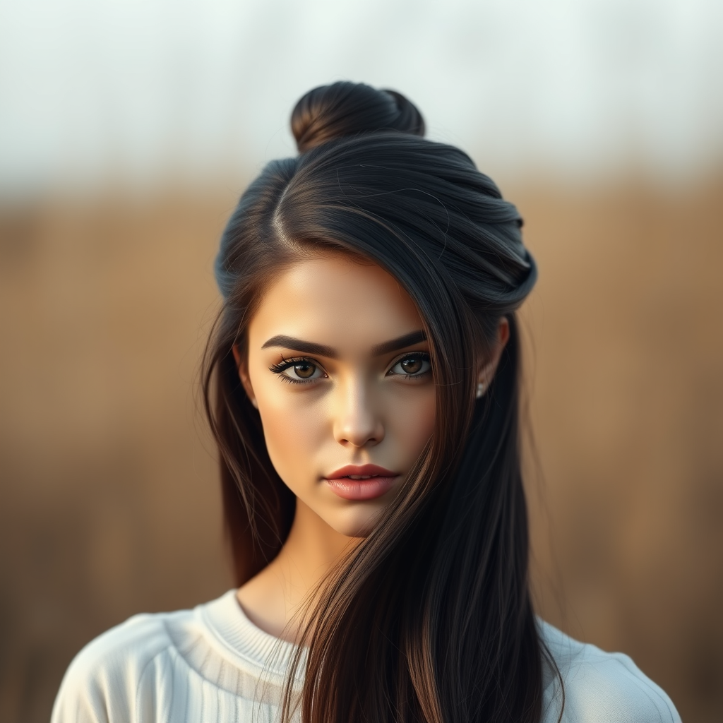 Long-haired girl styled in a sleek bun, set against a natural background, featuring a headshot portrait in beauty photography with minimalist makeup. Captures a high fashion, editorial look reminiscent of trends seen in Vogue and Unsplash. The image boasts detailed, intricate elegance with hyperrealism akin to a 3D model crafted in Maya, highlighting a symmetrical face. Features a high-resolution 4k texture, showcasing a single face with sharp focus. Avoids elements like bad framing, out of focus, deformities, or additional limbs and faces. The subject has natural hair color, presented in full color rather than black and white or grayscale.