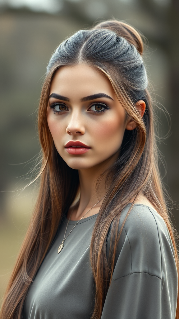 Long-haired girl with a sleek bun, set against a natural backdrop, rendered in a headshot portrait style emphasizing beauty photography. She features minimalist makeup and embodies high fashion in an editorial photo style reminiscent of Vogue and Unsplash trends. The image showcases detailed, intricate, and elegant hyperrealism, akin to a 3D model created with Maya. Her face displays symmetrical features with a focus on high-resolution texture, captured in stunning 4K. The composition maintains simplicity with a single individual, exuding timeless beauty and sophistication.