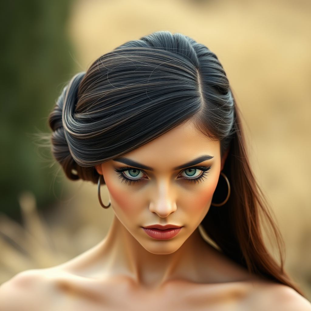 Long-haired woman with hair styled in a sleek bun against a natural background, captured in a headshot portrait. The focus is on beauty photography with minimalist makeup, conveying an aura of high fashion and editorial allure, akin to images seen on Vogue and Unsplash. The composition is detailed, intricate, and elegant, showcasing hyperrealism, with inspiration from 3D modeling software like Maya. Her face and body are symmetrical, highlighting a singular feminine presence with high-resolution texture in 4k.