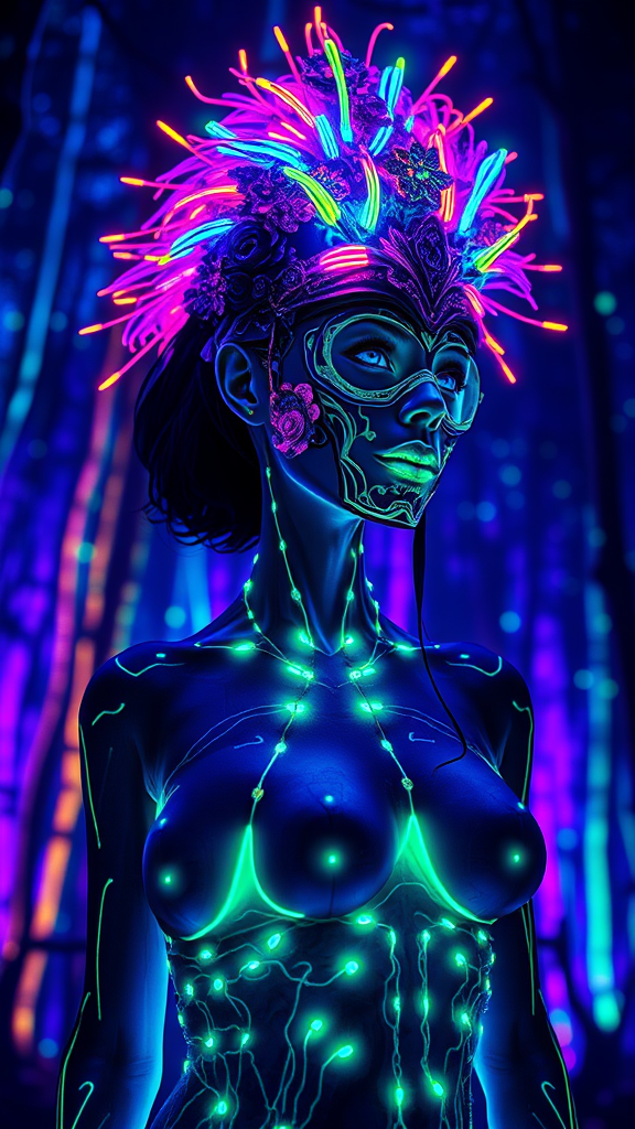Long-shot, full body portrait of a woman standing in a bioluminescent, vivid neon forest wonderland, with a captivating mix of blue, green, and purple hues. Her skin features intense glowing biomechanical rips, merging seamlessly with an insanely detailed, intricate headdress adorned with marginalia and complemented by a mask crafted from fiber-optics. Bright, colorful neon lights illuminate her form, casting a radiant glow against the vibrant backdrop. The woman gazes into the distance, evoking a sense of mystery and intrigue. The scene is designed with an asymmetrical composition, following the rule of thirds and golden ratio, and brought to life through photorealistic techniques utilizing octane render and unreal engine. Raytraced shadows, depth of field, and insane details contribute to the hyper-realistic and cinematic quality of the portrait, in an 8k resolution, enhancing the surreal dream-like atmosphere with particles and elements of weirdcore and cybercore.