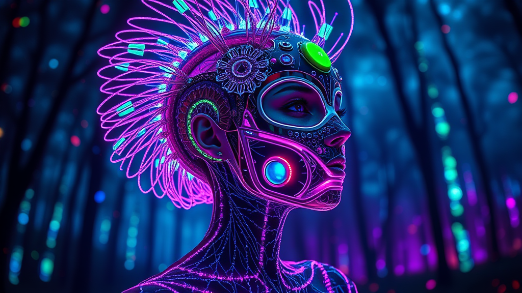 long-shot full body portrait of futuristic woman facing the horizon, showcasing lucid weirdcore cybercore elements. Her skin is adorned with bioluminescent glowing biomechanical fissures, seamlessly integrated into an insanely detailed, intricate headdress. She exudes elegance and mystery, wearing a mask crafted from interwoven fibre-optics that emit bright neon hues in blue, green, and purple. Her presence is both ethereal and mesmerizing. The vibrant backdrop is a resplendent neon wonderland, a forest alive with dreamlike qualities, brimming with floating particles and vivid colors of blue, green, and purple. The visual composition adheres to the rule of thirds and golden ratio, blending photorealism with cinematic realism through raytraced shadows, subtle depth of field, and asymmetric composition. The scene is presented in hypermaximalist detail, rendered through octane and unreal engines, achieving an 8k resolution for stunning clarity and visual impact.