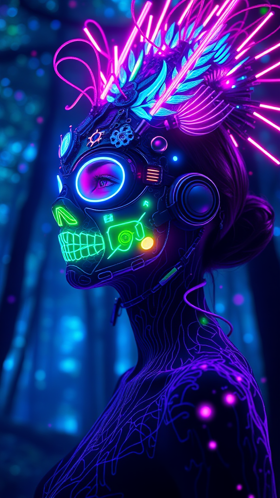 long-shot full body portrait of woman, lucid weirdcore cybercore, gazing into the distance, bioluminescent intense glowing biomechanical patterns emerging from her skin, styled with an intricately detailed marginalia headdress, stunning and enigmatic, wearing a fibre-optic mask with bright, vivid neon lights, an explosion of colors in blue, green, and purple, set against a glowing forest backdrop, a vivid neon wonderland filled with dream-like particles, blue, green, and purple hues in the environment, incorporating rule of thirds, golden ratio, emphasizing photorealism, with raytraced shadows and a striking depth of field, an asymmetric composition delivering hypermaximalist, unbelievably detailed visuals, rendered with octane, showcasing cinematic realism within an unreal engine, captured in 8k resolution.