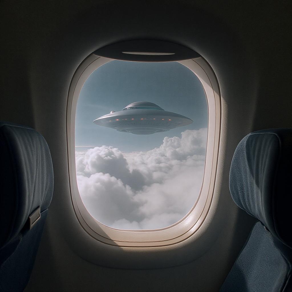 Looking out from the interior of a passenger plane, fluffy white clouds drift by as a mysterious UFO hovers just beyond the window, casting a curious shadow across the rows of seats and creating an air of intrigue and wonder inside the cabin.