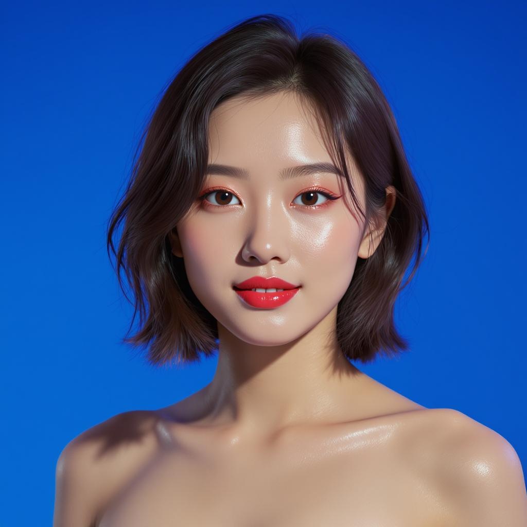 Loose shoulder-length hair, blue backdrop, ultra-realistic, cinematic frame, high quality, high detail, photorealism, subsurface scattering, shiny skin, volume lighting, intricate details, photorealistic rendering, 8K resolution, realistic texture, detailed lighting, ray tracing, defined eyebrows, small bust, meticulously detailed, skin glow, octane-rendered, cinematic focus, realistic complexion, natural features, detailed skin texture, convincing realism.