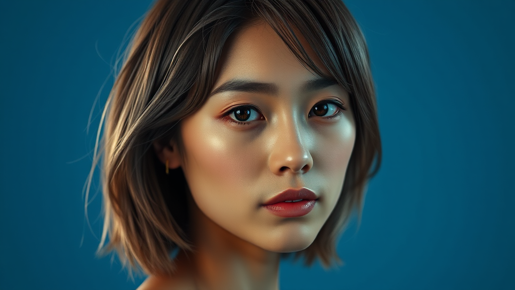 Loose, shoulder-length hair, blue background, ultra-realistic, cinematic frame, cinematic, highest quality, subsurface dispersion, complex textures, shiny skin, photorealism, volume lighting, intricately detailed, photorealistic, 8k resolution, rendered with cutting-edge technology, small-breasted subject, ray tracing, detailed rendering, bushy eyebrows, visually stunning, high-definition elements, vibrant appearance, seamless design, sharp focus, and a natural aesthetic.
