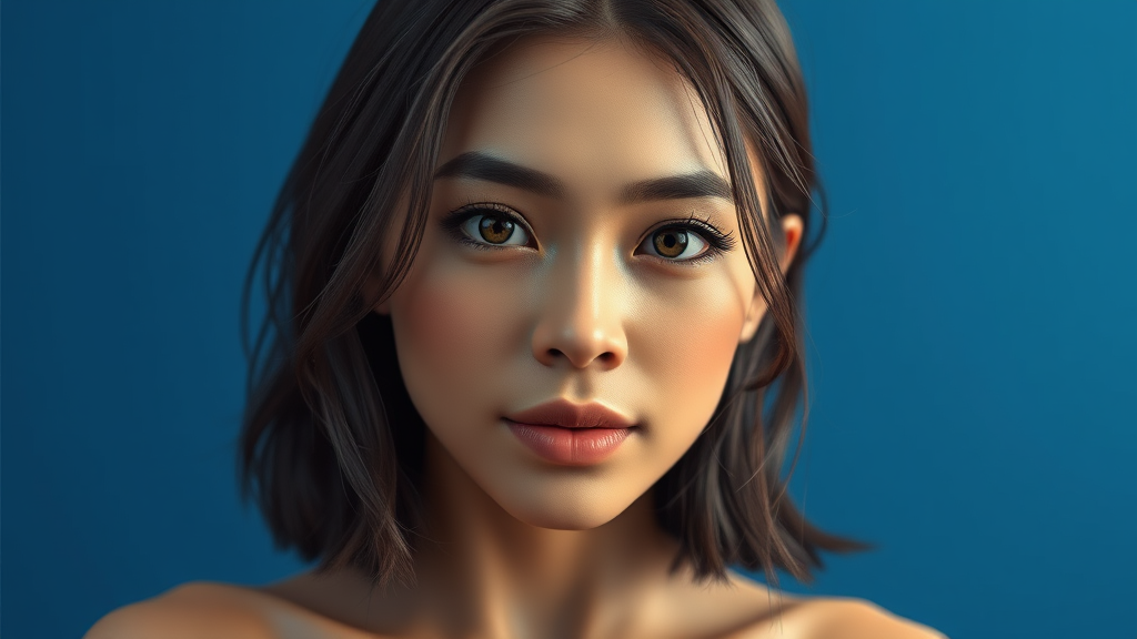 Loose shoulder-length hair, blue background, ultra-realistic, cinematic frame, high quality, subsurface dispersion, complex details, shiny skin, photorealism, volume lighting, highly detailed, photorealistic, octane rendering, 8k resolution, unreal engine, small breasts, ray tracing, bushy eyebrows, intricate features, captivating gaze, smooth complexion, natural expression, immersive lighting, subtle tonal contrasts, rich textures, balanced composition.