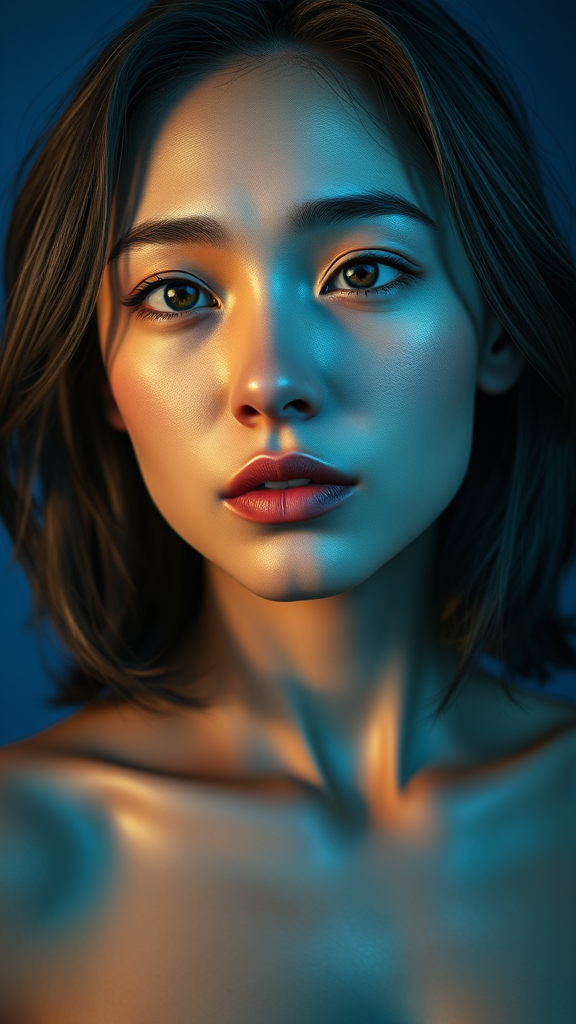 loose shoulder-length hair, blue background, ultra-realistic, cinematic frame, cinematic, shiny skin, subsurface scattering, photorealism, volume lighting, highly detailed, photorealistic, octane rendering, 8k, unreal engine, small breasts, ray tracing, bushy eyebrows, complex lighting, realistic skin texture, intricate details, natural expression, vibrant color palette