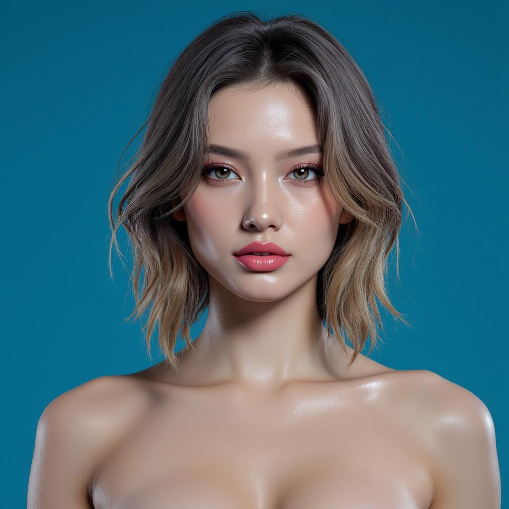 Loose shoulder-length hair, blue background, ultra-realistic, cinematic frame, high quality, subsurface dispersion, complex details, shiny skin, photorealism, volumetric lighting, highly detailed, small breasts, bushy eyebrows, photorealistic rendering, 8k resolution, ray tracing, octane rendering, unreal engine, cinematic atmosphere, highest resolution.