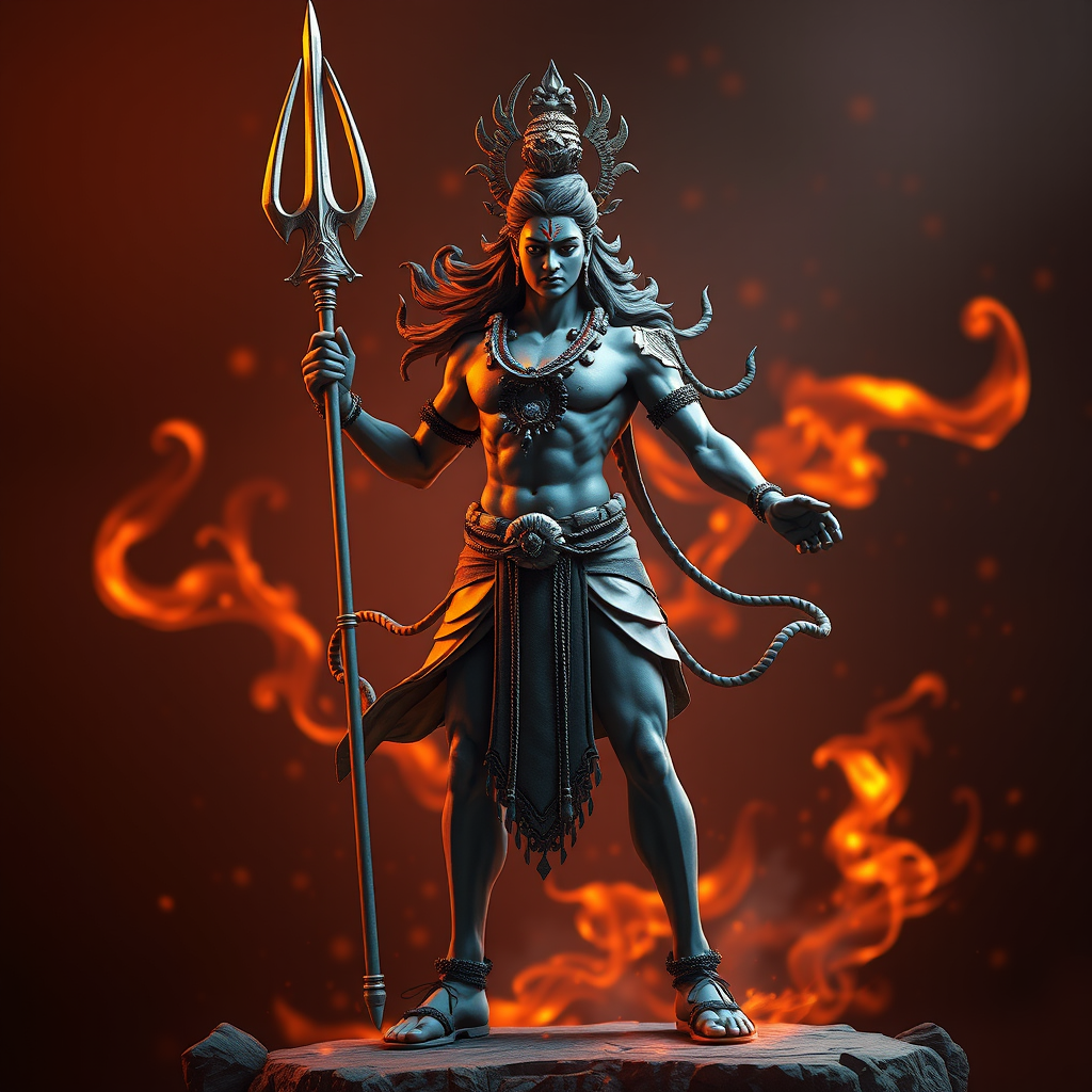 Lord Shiva from Indian mythology as a One Piece character with a symmetrical body wielding a three-pronged spear, full body, highly detailed and cinematic lighting, high contrast, character concept art in 8K on ArtStation, set against a backdrop of swirling flames, slight creative modifications incorporated