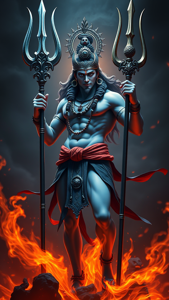 Lord Shiva in Indian mythology reimagined as a One Piece character, featuring a symmetric physique, wielding a majestic trident, intricately detailed, illuminated by dramatic cinematic lighting, with a high-contrast palette, evoking the style of Artstation character concept art, rendered in 8K, set against a backdrop of swirling mystical flames.