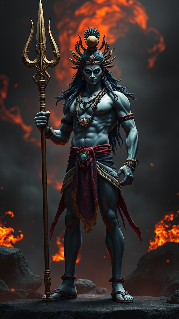 Lord Shiva-inspired character from Indian mythology infused with a One Piece aesthetic, featuring a perfectly symmetric physique and wielding a detailed, ornate three-pronged spear; the character is depicted in full body within an atmosphere that boasts cinematic lighting and high contrast. The environment is dramatic with a backdrop of swirling flames, offering a breathtaking visual. The concept art carries an ultra-high-definition, 8K resolution quality, inspired by ArtStation styles. The character design embraces creative but subtle modifications to integrate a distinct flair while echoing the essence of the original vision, setting a dynamic and mythic stage.