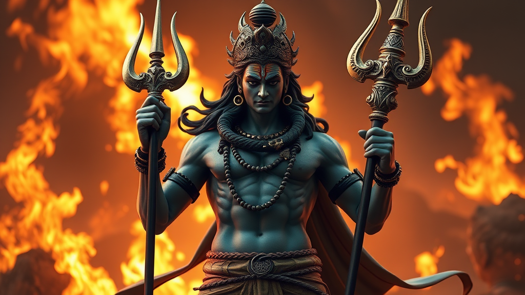 Lord Shiva inspired character from Indian mythology as a One Piece figure, featuring a perfectly symmetric physique and wielding an intricately designed trident. The scene is depicted with cinematic lighting and high contrast, capturing the character in incredible detail. Set against a backdrop of roaring flames, the character concept art is rendered with an 8K resolution, embodying the essence of power and divinity, as seen on ArtStation. The visual style blends mythological elegance with a modern artistic flair.