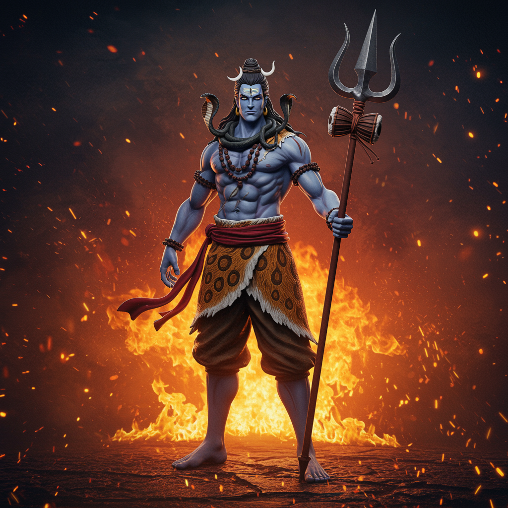 Lord Shiva-inspired character from Indian mythology, designed as a One Piece character with a perfectly symmetric body, wielding a majestic trishula. The full-body depiction highlights extremely detailed features with cinematic lighting and high contrast. The scene is imbued with an epic feel, akin to ArtStation character concept art, rendered in stunning 8K resolution. The background is alive with flames, enhancing the mystic aura of the character. The overall style is imaginative yet rooted in the essence of the original inspiration.