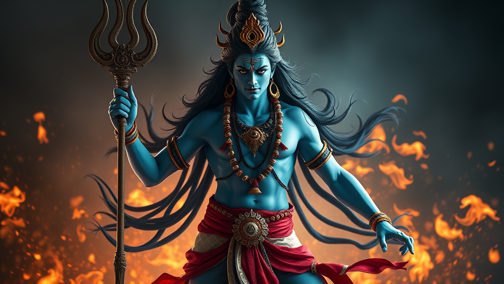 Lord Shiva inspired character, Indian mythology fusion, One Piece style, perfectly symmetrical body, brandishing a trishula, highly detailed full body art, cinematic lighting, high contrast, showcased on ArtStation, character concept design, 8K resolution, dynamic backdrop of flames, emphasizing mystic powers with subtle creative twists, legend-inspired attire, ethereal presence, fluid movement captured, atmospheric intensity, 9:16 aspect ratio, artistic stylization, vivid storytelling essence.