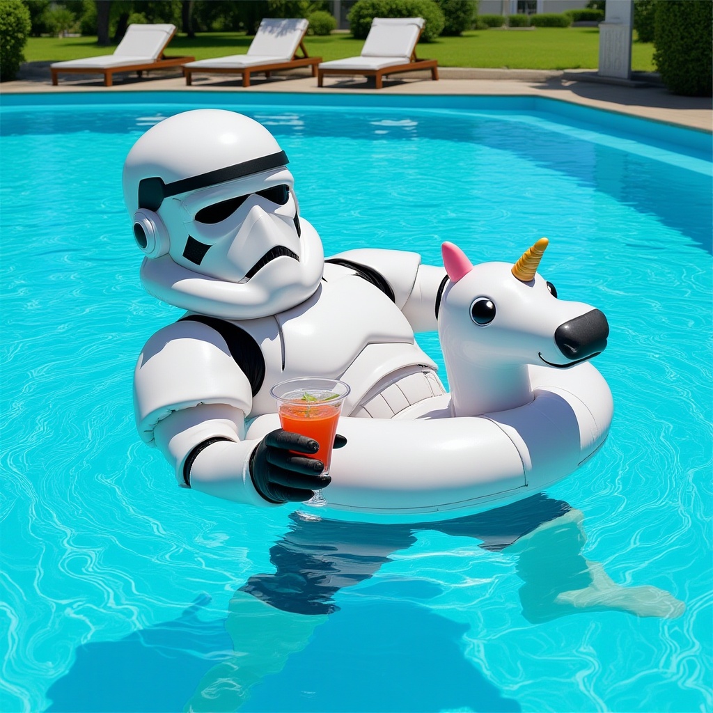 A stormtrooper lounging in a luxury pool, holding a tropical cocktail, wearing an inflatable unicorn ring, surrounded by clear blue water and bright sunlight reflecting off the surface.