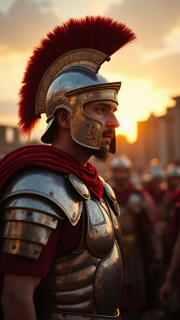 View this AI-generated image featuring low angle shot of a roman legionary clad in his traditional helmet and gleaming armor poised for the commencement of a new march taken with canon eos 90d 50mm lens under the dramatic light of the sunrise capturing the determination etched on his face against a