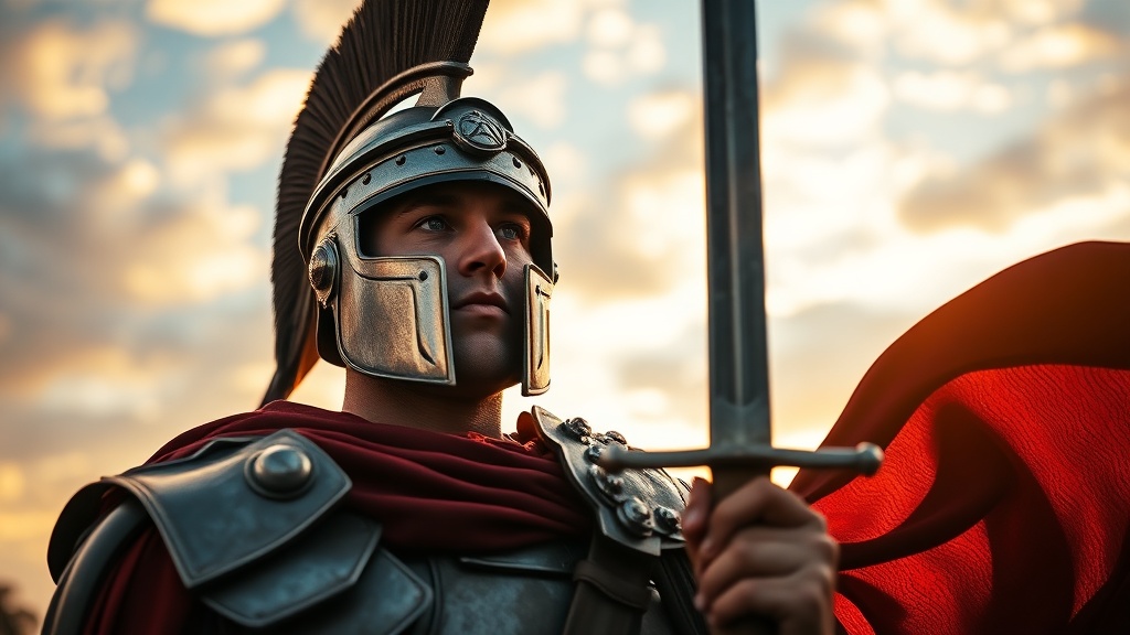 A dramatic low angle shot captures a Roman legionary, his intricate helmet and gleaming armor catching the sunlight, as he stands poised for the onset of a new march. The photo, taken with a Canon EOS 90D at 35mm, highlights the determination in his eyes and the strength in his stance. Behind him, the sky is a vibrant mix of early morning hues, adding a sense of anticipation. The legionary's cloak billows slightly in the breeze, hinting at the journey ahead, while his hand rests confidently on the hilt of his sword, embodying the disciplined spirit of ancient Rome.