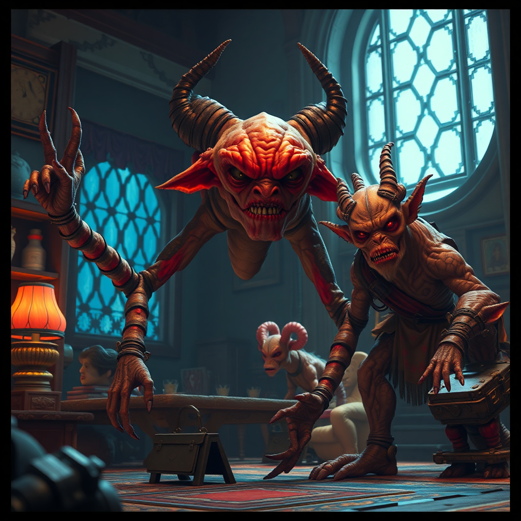 Low resolution, hyperdetailed pixel art, fantasy theme, retro art style, clean composition, inspired by Octopath Traveler art direction, cinematic shot with a 100mm lens perspective capturing a perfect angle, interior setting with pixel character foreground and voxel background, high contrast, HD quality, projects the illusion of UHD with its intricate details, features fantastical creatures with traits of deformed, disfigured, and mutated characteristics, showcases a surreal mutation with extra limbs and peculiar proportions, faces express uniqueness with unconventional features, scene captures a mythical ambiance and curiosity, contains a scene bursting with whimsical elements, picture bordered to enhance narrative, retains retro vibes amid a fantasy world, includes more than two characters with imaginative, larger-than-life figures.