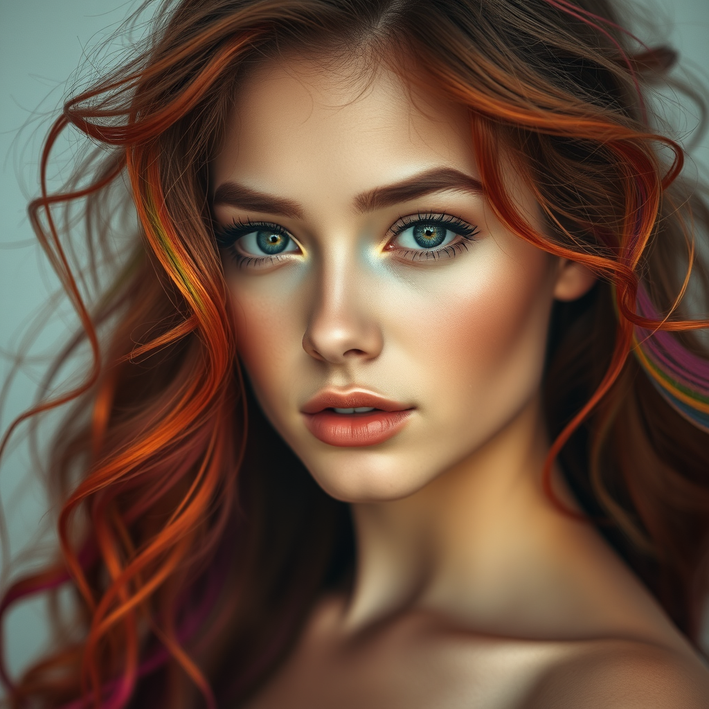 Lowkey portrait of a stunning woman with a captivating face, her loose wavy hair cascading in fiery hues intertwined with vibrant rainbow shades, resembling burning tendrils. Her skin glows with a soft radiance, emphasizing her natural beauty and ethereal presence.