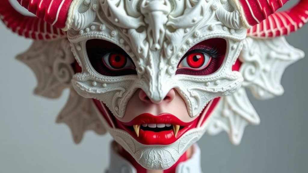 Lucia Maria Jorgos's avant-garde fashion mask features intricate white textures, inspired by Australian artistry in the style of Chiho Aoshima. This demonic, yet whimsical photograph merges the boldness of Deborah Azzopardi with the playful elements of dollcore, infused with Aries Moross's vibrant creativity. The work is a cunning blend of high-fashion appropriation art, capturing the essence of fashion week with a conceptual twist.