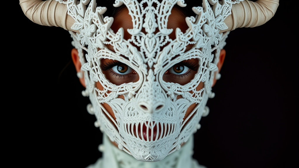 Lucia Maria Jorgos's avant-garde fashion mask features intricate white textures, worn by an Australian woman, inspired by Chiho Aoshima's dreamlike style. Captured in a demonic-themed photograph with a nod to Deborah Azzopardi's bold pop art, it weaves elements of dollcore and is influenced by Aries Moross's vibrant typography. The piece is a playful yet conceptual nod to high fashion appropriation artistry, perfect for the theatricality of fashion week, embodying a raw yet visionary spirit.