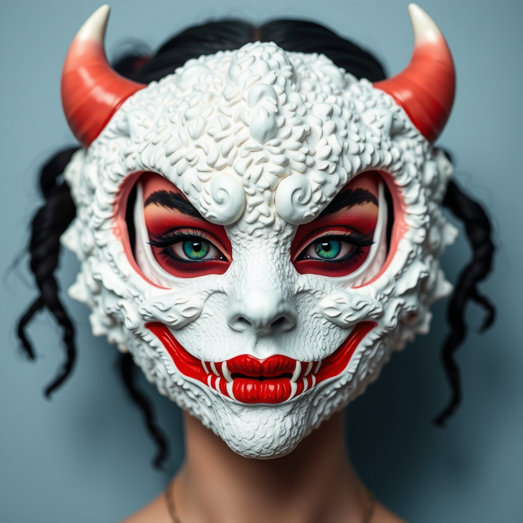 Lucia Maria Jorgos's fashion mask features a textured white design, embodying the essence of an Australian woman's style with influences from Chiho Aoshima. It presents a visually striking, demonic photograph aesthetic, drawing from the playful and vibrant aspects of Deborah Azzopardi and infused with dollcore elements. The creation aligns with Aries Moross's bold, conceptual flair, offering a fresh take on appropriation in high fashion. Showcased at fashion week, this piece is both avant-garde and whimsically imaginative, with a raw, dynamic twist.