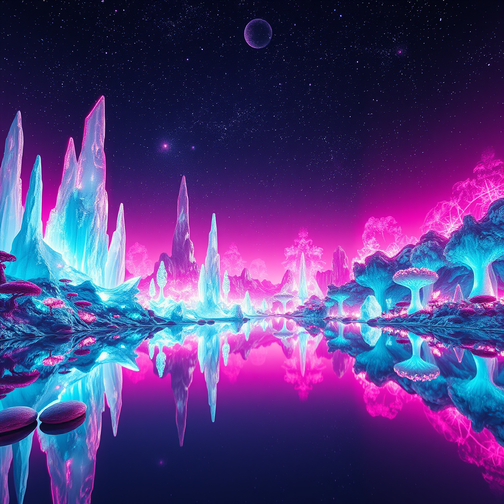 Luminous alien landscape under a vibrant neon glow, featuring towering crystalline structures and luminescent flora, casting vivid reflections on a tranquil, mirror-like lake beneath a star-filled sky. This surreal scene is framed in a wide panoramic view, capturing the enigmatic beauty of an otherworldly realm.