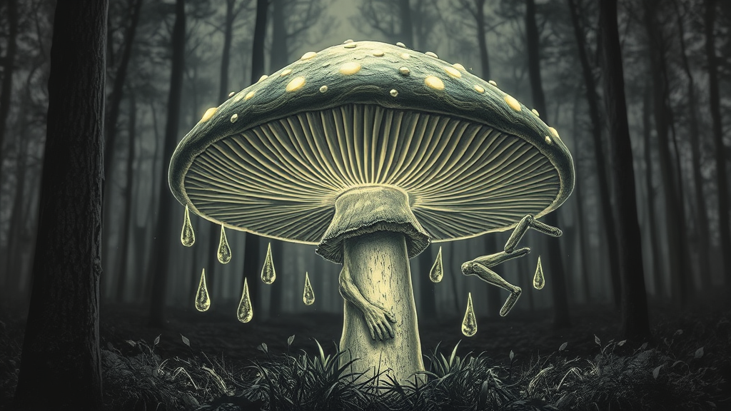 Luminous backlit glowing forest mushroom with neon lights, scattered drops, a hyperdetailed and faded black and white scene, featuring surreal and distorted elements with poorly drawn anatomy, including wrong or extra limbs and floating appendages amidst the forest backdrop.